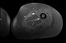 - ↑ Bhasin R, Ghobrial I (2013). "Diabetic myonecrosis: a diagnostic challenge in patients with long-standing diabetes". Journal of Community Hospital Internal Medicine Perspectives. 3 (1): 20494. doi:10.3402/jchimp.v3i1.20494. PMC 3716030. PMID 23882392.