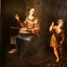 According to de Dominici's account of Diana's life, Diana was not content painting only for private households and wanted her work to be public to make it known that women could attain excellence in art.[4] Therefore, Stanzione provided her with a commission at the church of the Pietà de’ Turchini where she painted an image of the Birth of the Virgin on the ceiling near the entrance of the church, and the Death of the Virgin on the ceiling towards the high altar. According to de Dominici those images were so beautiful that people believed her teacher Stanzione had painted them.[5] The paintings in the Pietà de’ Turchini were most likely destroyed in 1638 when the church roof collapsed.[6] For the Royal Church of Monte Oliveto in Naples, Diana painted an image depicting the Madonna breastfeeding the infant Christ, while for the sacristy of Santa Maria degli Angeli, she painted an image of Saint John the Baptist with a lamb. Unfortunately, both of those works no longer exist.[7] A possible posthumous portrait of Diana by Andrea Vaccaro (c. 1660) can be found in a Neapolitan private collection.[8]
