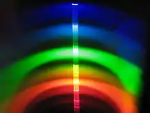 The wavelength dependence in the grating equation shows that the grating separates an incident polychromatic beam into its constituent wavelength components at different angles, i.e., it is angular dispersive. Each wavelength of input beam spectrum is sent into a different direction, producing a rainbow of colors under white light illumination. This is visually similar to the operation of a prism, although the mechanism is very different. A prism refracts waves of different wavelengths at different angles due to their different refractive indices, while a grating diffracts different wavelengths at different angles due to interference at each wavelength.