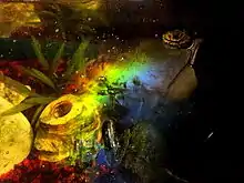A biofilm on the surface of a fishtank produces diffraction grating effects when the bacteria are all evenly sized and spaced. Such phenomena are an example of Quetelet rings.