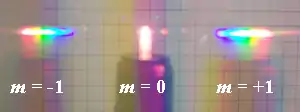 A light bulb of a flashlight seen through a transmissive grating, showing two diffracted orders. The order m = 0 corresponds to a direct transmission of light through the grating. In the first positive order (m = +1), colors with increasing wavelengths (from blue to red) are diffracted at increasing angles.