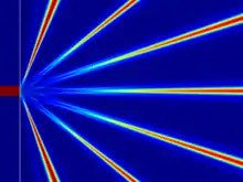In optics, a diffraction grating is an optical grating with a periodic structure that diffracts light into several beams traveling in different directions (i.e., different diffraction angles). The emerging coloration is a form of structural coloration.[1][2] The directions or diffraction angles of these beams depend on the wave (light) incident angle to the diffraction grating, the spacing or distance between adjacent diffracting elements (e.g., parallel slits for a transmission grating) on the grating, and the wavelength of the incident light. The grating acts as a dispersive element. Because of this, diffraction gratings are commonly used in monochromators and spectrometers, but other applications are also possible such as optical encoders for high-precision motion control[3] and wavefront measurement.[4][5]