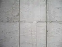 The old stone work may only need cleaning or sandblasting, but it may need more. Firstly, the building exterior (facade) needs to be inspected for unsafe conditions.[21] Next, the building walls need to be inspected for water leakages.[22] The most likely needs are mortar restoration (repointing), applying consolidants to the old stone, or replacing pieces of stone that are deteriorated (damaged) beyond the point of any repair. The repointing is the removal of existing damaged mortar from the outer portion of the joint between stone units and its replacement by new mortar matching the appearance of the old.[23] The consolidants re-establish the original natural bonding between the stone particles that weathering has removed.[24] Deteriorated pieces of stone work are replaced with pieces of stone that match the original as much as possible. Exterior dimension stone will often change color after exposure to weather over time. For example, Indiana Limestone will weather from a tan to an attractive light yellow. Interior dimension stone can sometimes change its shade a little over time too. For both, it may not be possible to find an exact match, even from the original quarry. Stone will often change its appearance from location to location in the same quarry. If the dimension stone renovationist is truly fortunate, the original builder put aside some spare pieces of the stone for future need.