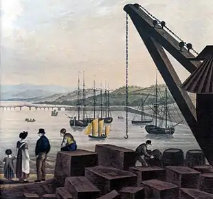 Large blocks of granite dimension stone being loaded at Teignmouth in Devon, southern England, in 1827