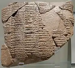 At particular times, states could conclude diplomatic accords, of which the names varied (for example, in Akkadian niš ili(m), riksu(m), māmītu(m), or adê in the neo-Assyrian era; lingaiš- or išhiul- in Hittite; bêrit in Hebrew).[22] These generally followed periods of war, and were intended to end them. These treaties were not necessarily written down, but written treaties appeared relatively early— the earliest known example dates to the 24th century, and concerns the cities of Ebla and Abarsal, the latter of which involved Naram-Sin of Akkad and an Elamite king.[23] In the Amorrite period, many tablets detailing the protocols of oaths of alliance between kings were unearthed at Mari, Tell Leilan, and Kültepe, or are of unknown provenance (accords between Shadlash and Nerebtum and Eshnunna, Larsa and Uruk).[24] And the texts of treaties date to the following period, found at Alalakh, Ugarit, and above all Hattusa, the Hittite capital, the treaty between Hittite king Hattusili III and Egyptian king Ramses II being additionally known by its Egyptian copy inscribed in hieroglyphs, the only time copies of a treaty have been found at sites of both parties. Concerning the neo-Assyrian period, international treaties were exhumed at Nineveh; another is linked by an Aramaic inscription to Sfire.[25]