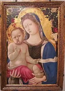 In the painting, the Virgin is also depicted in a way that had been popularized in Siena by Gentile da Fabriano: an Italian painter who was best known for his international gothic painting style.[12] Other artists who depicted the Virgin in a similar manner during this time were Giovanni di Paolo for his Branchini Madonna of 1427 and Andrea di Bartolo for his Madonna of Humility.[12] Yet, there are several artistic elements within Domenico's Madonna of Humility that derive from techniques frequently observed in Florentine works. The frontal view of The Virgin, who is presented in an asymmetric composition, is said to have been inspired by Masaccio's Madonna of Humility.[13] Foreshortened halos and Virgin's crown were rare during the time that Domenico di Bartolo's painting was executed, and can only be found in the Pisa altarpiece executed by Masaccio. There, too, is an illustration of the baby with fingers in his mouth, which strongly recalls back to Masaccio's Pisa altarpiece, which illustrates the Christ child eating grapes.[14] Domenico's Madonna of Humility successfully models lights and darks within the flesh tones, and this too is done in the style of Masaccio. However, renowned British art historian John Pope-Hennessy states in his articles that Domenico di Bartolo cannot be a fully Masacciesque painter. Whilst painters like Filippo Lippi or Andrea di Giusto depict their figures to stand up in a stiff manner, those of Domenico di Bartolo possess a certain "Gothic flexibility".[11] Hennessy observes a certain fluid quality in Bartolo's paintings. For example, the Madonna's knee is bent and the angels to the left of the Madonna have curved bodies. As a result, it is infinitely more likely that Domenico drew stronger influences for the painting's details from Jacopo della Quercia.[11]