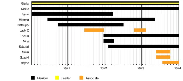 On February 14, 2021, MaiHime (Himeka and Maika) defeated Oedo Tai (Bea Priestley and Konami) to win the Goddess of Stardom Championship.[18] Natsupoi defeated AZM to win the High Speed Championship at All Star Dream Cinderella on March 3, where all the members of the stable were holding titles, until Giulia lost her Wonder of Stardom Championship to Tam Nakano in a hair vs hair match the same night, after which she got her hair shaved.[19] At Yokohama Dream Cinderella 2021 on April 4, MaiHime lost the Goddess of Stardom Championship to fellow members Giulia and Syuri after an inter-stable clash.[20] For the 2021 5 Star Grand Prix, all the members of the unit were listed as participants in the tournament.[21] Syuri defeated Momo Watanabe in the finals of the event from September 25, to win the trophy. On October 3, Maika, Natsupoi and Himeka teamed up as MaiHimePoi to dethrone Cosmic Angels (Tam Nakano, Mina Shirakawa and Unagi Sayaka) by taking the Artist of Stardom Championship away from them.[22] At Stardom 10th Anniversary Grand Final Osaka Dream Cinderella on October 9, MaiHimePoi successfully defended the Artist of Stardom Championship against Queen's Quest (Momo Watanabe, AZM and Saya Kamitani).[23] At Osaka Super Wars on December 18, MaiHimePoi won the ¥10 Million Unit Tournament also disputed for the Artist of Stardom Championship by defeating Marvelous (Takumi Iroha, Rin Kadokura and Maria) in the semi-finals and Stars (Mayu Iwatani, Hazuki and Koguma) in the finals, scoring two consecutive defenses for the titles and winning the money prize.[24] At Dream Queendom on December 29, MaiHimePoi successfully defended the Artist of Stardom Championship against Cosmic Angels (Mina Shirakawa, Unagi Sayaka and Mai Sakurai), Giulia made her in-ring return and defeated Konami, and in the main event, Syuri defeated Utami Hayashishita to win the World of Stardom Championship.[25]