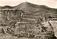 The historical name Ragusa is recorded in the Greek form Ῥαούσιν (Rhaousin, Latinized Ragusium) in the 10th century. It was recorded in various forms in the medieval period, Rausia, Lavusa, Labusa, Raugia, Rachusa. Various attempts have been made to etymologize the name. Suggestions include derivation from Greek ῥάξ, ῥαγός "grape"; from Greek ῥώξ, ῥωγός "narrow passage"; Greek ῥωγάς "ragged (of rocks)", ῥαγή (ῥαγάς) "fissure"; from the name of the Epirote tribe of the Rhogoi, from an unidentified Illyrian substrate. A connection to the name of Sicilian Ragusa has also been proposed. It has been proposed by V. Orel that the Proto-Albanian *rāguša of Albanian rrush 'grape' is related to Ragusa or the source of the name. Putanec (1993) gives a review of etymological suggestion, and favours an explanation of the name as pre-Greek ("Pelasgian"), from a root cognate to Greek ῥαγή "fissure", with a suffix -ussa also found in the Greek name of Brač, Elaphousa.[12] The name of the city in the native Dalmatian language, now extinct, was Ragusa, as shown by a 1325 letter in Dalmatian.[13] In Albanian, the city was historically referred to as Rush (Albanian definite form: Rushi), from Latin Ragusium.[14]