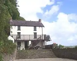 A month later, in May 1949, Thomas and his family moved to his final home, the Boat House at Laugharne, purchased for him at a cost of £2,500 in April 1949 by Margaret Taylor.[167] Thomas acquired a garage a hundred yards from the house on a cliff ledge which he turned into his writing shed, and where he wrote several of his most acclaimed poems.[168] He also rented "Pelican House" opposite his regular drinking den, Brown's Hotel, for his parents[169][170] who lived there from 1949 until 1953.