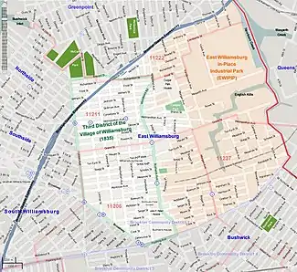 Historically, this neighborhood was not part of the Village of Williamsburgh. In the late 19th century the region east of the present-day Humboldt Street, west of the Newtown Creek, south of Meeker Avenue, and north of Metropolitan Avenue was the 18th ward of the City of Brooklyn.[15] The north part of the EWIP is served by the Greenpoint Post Office and is considered by some to be part of Greenpoint. The portion of the EWIP to the south of Metropolitan Avenue was historically part of Bushwick and is still referred by many as being in Bushwick.
