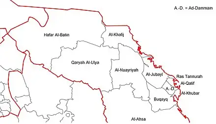 ![]() Governorates of Eastern Province Al Asha Governorate, by far the largest, is shown partially only ![]() New Al Udayd Governorate, cut out of Asha Governorate in the Southeast |