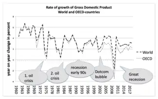 Economic growth in the United States slowed down after 1973.[34] In contrast, growth in Asia has been strong since then, starting with Japan and spreading to Four Asian Tigers, China, Southeast Asia, the Indian subcontinent and Asia Pacific.[35] In 1957 South Korea had a lower per capita GDP than Ghana,[36] and by 2008 it was 17 times as high as Ghana's.[37] The Japanese economic growth has slackened considerably since the late 1980s.