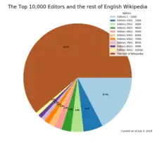 Pie chart of all edits to the English Wikipedia, with a slice for each thousand of the 10,000 most active Wikipedians, and everyone else in brown (as of July 3, 2019)