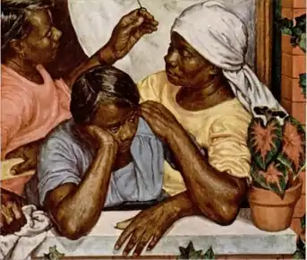 In 1938, the Virginia Museum of Fine Arts gave him a solo exhibition that included a mural, "Captain Francis Eppes Making Friends with the Appomattox Indians", which he had made for a post office in Hopewell, Virginia, as part of the Depression-era United States post office murals project.[37] Meant to inspire confidence at a time when many Americans felt despair, the mural, shown above, depicts an English adventurer, Francis Wayles Eppes VI, clasping the hand of the chief of the Appomattox Indians.[38][39] A contemporary describes the painting's uplifting and romantic subject: "The Englishman and the Indian, half-reclining, face each other on a vast stretch of beach and clasp hands in a gesture of great strength and grace. Eppes gestures with his right hand at his ship on the water, its sails white against a light-bathed sky. The Indian is a beautiful fellow, and just behind him are smaller, symbolic figures of other Indians on the water. It is a wonderfully lively, noble and happy picture, from the bright virgin look of the fresh beach to the thin, symbolic line of the city of the future on the horizon".[3] Other critics viewed Archer's heroic treatment of his subject as absurd and one of them noted that the friendly greeting that he showed between Eppes and the chief was a myth. The Appomattox did not welcome the English settlers. At the time Eppes first arrived from England, they had been defending themselves against incursions by the colonists in a series of conflicts known as the Anglo-Powhatan Wars.[40][41] Far from treating them as brothers, Eppes led an attack on the tribe in 1627, only a few years after his arrival.[39] The 1938 solo exhibition also contained fifteen paintings having African-American subjects. At the time, Archer told an interviewer that he preferred African-American models because he found in them a vitality he could not find in other figural subjects adding that he hoped American artists would take advantage of the "vitality, exuberance and color" of African-American culture to help make "great art" that would rival the art of European painters.[3] During this exhibition, a reporter said Archer was "considered Virginia's greatest contemporary painter, and one of the best of the young artists in the United States".[2] In 1939, a solo exhibition at the Gertrude Herbert Institute of Art, Augusta, Georgia, also featured paintings of African-Americans [42]