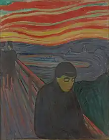 With this painting, Munch met his stated goal of "the study of the soul, that is to say the study of my own self".[53] Munch wrote of how the painting came to be: "I was walking down the road with two friends when the sun set; suddenly, the sky turned as red as blood. I stopped and leaned against the fence, feeling unspeakably tired. Tongues of fire and blood stretched over the bluish black fjord. My friends went on walking, while I lagged behind, shivering with fear. Then I heard the enormous, infinite scream of nature."[54] He later described the personal anguish behind the painting, "for several years I was almost mad... You know my picture, 'The Scream?' I was stretched to the limit—nature was screaming in my blood... After that I gave up hope ever of being able to love again."[55]