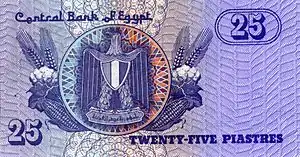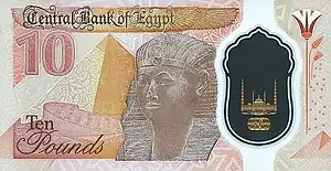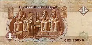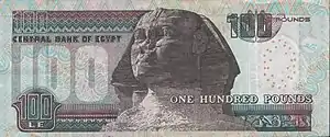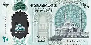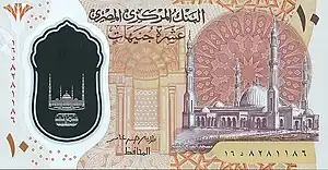 All Egyptian banknotes are bilingual, with Arabic texts and Eastern Arabic numerals on the obverse, and English texts and Western Arabic numerals on the reverse. Obverse designs tend to feature an Islamic building with reverse designs featuring Ancient Egyptian motifs (buildings, statues and inscriptions). During December 2006, it was mentioned in articles in Al Ahram and Al Akhbar newspapers that there were plans to introduce £200 and £500 notes. As of 2019, there are £200 notes circulating but there are still no plans for issuing £500 notes.[18] Starting from 2011 the 25 PT, 50 PT and £1 banknotes were phased out in favour of more extensive use of coins. However, as of June 2016 the National Bank of Egypt reintroduced the £1 banknote into circulation[19] as well as 25 PT and 50 PT notes in response to a shortage of small change.