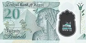 The governor of the Central Bank of Egypt announced that the Central Bank of Egypt will issue polymer notes by the beginning of 2021. This change comes as the CBE moves its headquarters to the new administrative capital.[20] On July 31, 2021, the President of Egypt reviewed the notes of £10 and £20, to be issued in November 2021.[21] In August 2021, the Central Bank was forced to confirm that rainbow holograms on the new banknotes were a secure watermarking feature to prevent counterfeiting, after online critics suggested it was a covert message of support for LGBT rights.[22][23] Just nearly 2 years after the £10 note was released, the Central Bank of Egypt released the new £20 polymer banknote. The paper variants of the same denominations will continue to be legal tender.