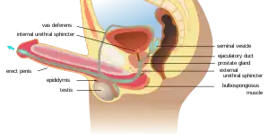 During the emission phase of ejaculation, sperm travels from the epididymis through the vas deferens mixing with fluids from the male accessory glands as it enters the urethra. During the expulsion phase, rhythmic contractions of the pelvic floor and bulbospongiosus muscles push the semen towards the urinary meatus expelling it from the penis in several spurts.