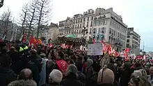 After the legislation was first proposed in parliament, and while it was still in its draft stage, it was met with significant public opposition and became a catalyst for strikes and demonstrations organised by trade unions and student groups.[11][12] A broader protest movement known as Nuit debout arose within the context of opposition to the legislation; the movement stated its aims as "overthrowing the El Khomri bill and the world it represents".[13]