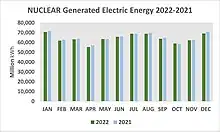 Actual USA utility scale electricity generation[15] in 2022 was 4230.723 terawatt-hours (TWh) and was up 134.883 TWh (3.29%) from 2021. The USA also imported 56.97 TWh and exported 15.758 TWh:[16] making a total of 4271.88 TWh for consumption, up 114.78 TWh (2.78%) from 2021.