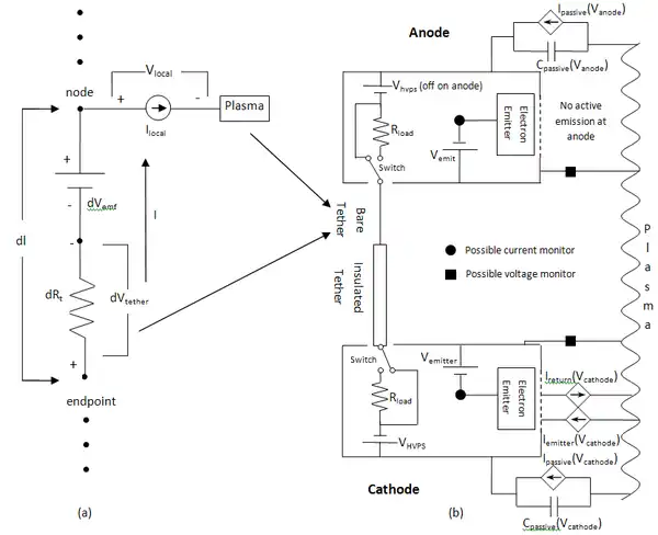 (a) A circuit diagram of a bare tether segment with (b) an equivalent EDT system circuit model showing the series bias grounded gate configuration.