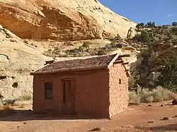 The Behunins lived there for only a year, leaving for Fruita after a flood threatened the house and its fields. The one story sandstone structure measures 13 feet (4.0 m) by 16.5 feet (5.0 m), with a single room. Elijah and his wife and their 13 children all lived within the home. The walls are sandstone covered with a plaster-cement wash. The roof structure is wood, covered with wood sheathing and bentonite clay. The cabin was renovated in the 1960s by the National Park Service and represents the most intact example of a settler cabin in Capitol Reef National Park.[2]