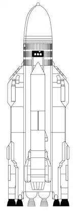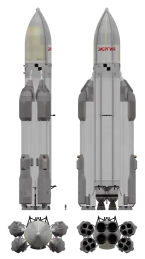 Energia (Russian: Энергия, romanized: Energiya, lit.'Energy'; GRAU 11K25) was a 1980s super-heavy lift launch vehicle. It was designed by NPO Energia of the Soviet Union as part of the Buran program for a variety of payloads including the Buran spacecraft. Control system main developer enterprise was the Khartron NPO "Electropribor".[3][4] The Energia used four strap-on boosters each powered by a four-chamber RD-170 engine burning kerosene/LOX, and a central core stage with four single-chamber RD-0120 (11D122) engines fueled by liquid hydrogen/LOX.[5]