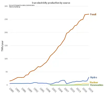 Iran’s domestic consumption and production have steadily grown together since 1984 and it is still heavily reliant on traditional thermal energy sources of electricity, with a small fraction being produced by hydroelectric plants.[50] As of 2023 a quarter of electricity is generated from oil and most of the rest is gas-fired.[51] Today Iran ranks 19th largest producer and 20th largest consumer of electricity in the world.[52] A research by the Ministry of Energy indicated that between 15,000-20,000 megawatts of capacity should be added in Iran in the next 20 years.[53] In recent years Iran has put greater emphasis on participation of domestic and foreign investors in electricity generation sector, with projects underway to add 40,000 MWh more capacity to the national grid.[54]