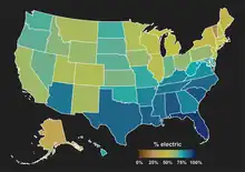 The United States' portion of the electrical grid in North America had a nameplate capacity of 1,213 GW and produced 3,988 TWh in 2021, using 37% of primary energy to do so.[6][7] The country is the second-largest producer and consumer of electricity, behind China.[3] Natural gas overtook coal as the dominant source for electric generation in 2016. While coal use has been dropping, it remained larger than either nuclear or renewables.[6]