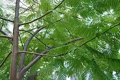 The alternate leaves are bipinnate compound, 15–40 cm (5.91–15.75 in) long and 17 cm (6.69 in) broad with a 2–6 cm (0.79–2.36 in) petiole bearing four to 15 pairs of pinnae, each pinna with 40–70 leaflets; the leaflets are slender, oblong, 8–15 mm (0.315–0.591 in) long by 2–4 mm (0.079–0.157 in) wide. Near its base, the twiggy petiole bares a small, raised, oval gland. The leaves are confined to the outer shell of the crown, yet they are plentiful enough to make it moderately dense and green. The guanacaste is evergreen, or briefly deciduous for 1–2 months during the dry season. Most foliage is shed in December, at the start of the dry season. In late February, a growth surge is initiated that re-establishes a fresh, thick crown by April.