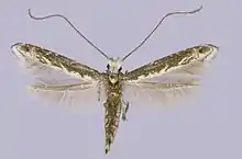 The wingspan is 8.3–10 mm. The forewings are brown with a narrow white band on the dorsum from the base to 2/3 of the entire length and with three narrow white bands beginning at the dorsal margin near 1/2 to 3/4 length of the wing and extending obliquely toward the wing apex, terminating before reaching mid-width of the wing. Dull white spots are scattered on the costal half and there is a narrow silver band with metallic reflection extending from the costa to the dorsum at 5/6 length. The distal 1/6 is orange-brown with a black dot centrally, franked by a short white band near the dorsum. The distal end is fringed with a narrow white band. The hindwings are brown.