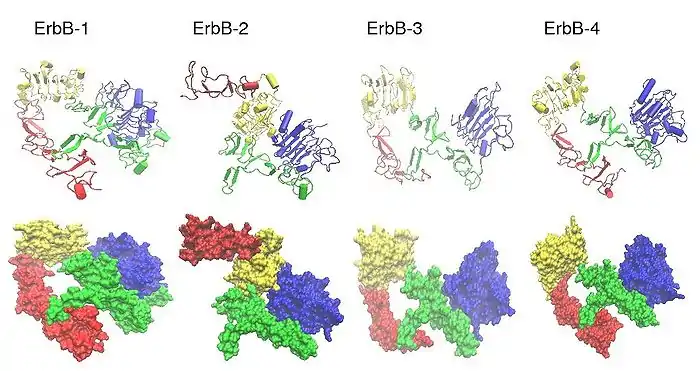 The figure below shows the tridimensional structure of the ErbB family proteins, using the pdb files 1NQL (ErbB-1), 1S78 (ErbB-2), 1M6B (ErbB-3) and 2AHX (ErbB-4):[10][11][12][13]