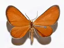 It has a wingspan of 20–24 millimetres (0.79–0.94 in). The wings are bright orange with a narrow black border. Antennae, tarsi and tibiae are black.[1][2]