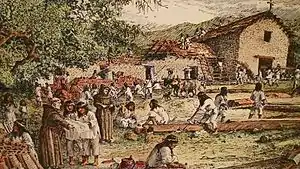 By 1499, Spanish settlers on Hispaniola had discovered gold in the Cordillera Central.[15] This created a demand for large amounts of cheap labor, and an estimated 400,000 Taíno people from across the island were soon enslaved to work in gold mines.[16] As discussed above, this practice of enslaving native peoples was immediately but ineffectually opposed by the Spanish Crown. Succeeding governors were appointed and recalled, often because of stories about their treatment of native populations.[17] The Taíno people also resisted fiercely and were put down in a series of brutal massacres.[18] Nonetheless, forced labor continued and was institutionalized as the encomienda system during the first decade of the 16th century.[19] Under this system, private Spanish colonizers (encomenderos) were granted the right to the labor of groups of non-Christian Indigenous people.[20] Although based on similar grants given during the Reconquista in Spain, in the Caribbean the system quickly became indistinguishable from the slavery it replaced[5] By 1508, the original Taíno population of 400,000 or more had been reduced to around 60,000.[16] Spanish slave-raiding parties travelled across the Caribbean and "carried off entire populations" to work their colonies.[21] Although disease is often pointed to as the cause of this population decline, the first recorded smallpox outbreak in the New World was not until 1518.[22] Historian Andrés Reséndez at the University of California, Davis asserts that even though disease was a factor, the Indigenous population of Hispaniola would have rebounded the same way Europeans did following the Black Death if it were not for the constant enslavement they were subject to.[4] He says that "among these human factors, slavery was the major killer" of Hispaniola's population, and that "between 1492 and 1550, a nexus of slavery, overwork and famine killed more natives in the Caribbean than smallpox, influenza or malaria."[23] By 1521, the islands of the northern Caribbean were largely depopulated.[4]