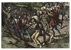 During and after the European colonization of the Americas, European settlers practiced widespread enslavement of Indigenous peoples. In the 15th Century, the Spanish introduced chattel slavery through warfare and the cooption of existing systems.[1][2] A number of other European powers followed suit, and from the 15th through the 19th centuries, between two and five million Indigenous people were enslaved,[lower-alpha 1][3][4] which had a devastating impact on many Indigenous societies, contributing to the overwhelming population decline of Indigenous peoples in the Americas.[5]