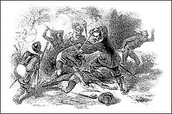In Brazil, colonists were heavily dependent on Indigenous labor during the initial phases of settlement to maintain the subsistence economy, and natives were often captured by expeditions called bandeiras ("Flags", from the flag of Portugal they carried in a symbolic claiming of new lands for the country). Bandeirantes frequently targeted Jesuit reductions, capturing thousands of natives from them in the early 1600s.[28] In 1629, Antônio Raposo Tavares led a bandeira, composed of 2,000 allied índios, "Indians", 900 mamelucos, "mestizos" and 69 whites, to find precious metals and stones and to capture Indians for slavery. This expedition alone was responsible for the enslavement of over 60,000 Indigenous people.[76][77][78][79] Conflict between settlers who wanted to enslave Indians and Jesuits who sought to protect them was common throughout the era, particularly as disease reduced the Indian populations. In 1661, for example, Padre António Vieira's attempts to protect native populations lead to an uprising and the temporary expulsion of the Jesuits in Maranhão and Pará.[28] The importation of African slaves began midway through the 16th century, but the enslavement of Indigenous peoples continued well into the 19th century.