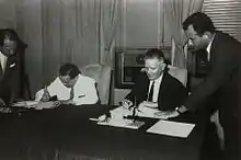 Signing ceremony of the fourth Surplus Agricultural Commodities Agreement, signed by Ambassador Drumright (right) and Foreign Minister Shen Chang-huan (left).
