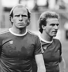 In 1972–73, Bayern reached the last eight before losing to holders Ajax, who would go on to retain their title.[12] However, the Bundesliga was successfully defended, and another opportunity in the European Cup beckoned in 1973–74. That campaign was almost a very short one, with a penalty shootout required to overcome Swedish semi-professionals Åtvidaberg in the first round (Bayern were sufficiently impressed with the opposition's Conny Torstensson to sign him a short time later).[21][22] Subsequent rounds behind the Iron Curtain, including a narrow hard-fought 7–6 victory over East Germans Dynamo Dresden for the 'true German Championship',[23][24][25][26] brought the club to their first Champions Cup final, to be staged at Heysel Stadium in Brussels, the same venue as West Germany's Euro victory. The opposition, Atlético Madrid, were known for their defensive strength, and the 90 minutes ended goalless. When Atlético scored with only five minutes of extra time remaining it seemed like Bayern's dream was over, but a Schwarzenbeck goal with a shot from 30 yards in the last minute meant the tie was saved and a replay was needed.[12][27][28] 48 hours later, Bayern produced a superior performance, Hoeneß and Müller each scoring twice, and the 4–0 result brought European football's biggest prize to Bavaria, and indeed to Germany, for the first time.[12][10][27][28]
