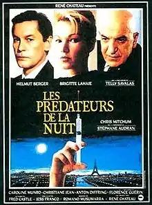 Faceless (French: Les Prédateurs de la nuit) is a 1988 French slasher film directed by Jesús Franco. The film is about Dr. Flamand (Helmut Berger) and his assistant Nathalie (Brigitte Lahaie) who lure unsuspecting victims to use their skin to perform plastic surgery on the doctor's disfigured sister - a plot reminiscent of Franco's earlier film, The Awful Dr. Orloff (1961). Hallen (Telly Savalas) is a New York businessman who hires private detective Sam Morgan (Christopher Mitchum) to find his missing fashion model daughter Barbara (Caroline Munro). Other elements of the story include a Nazi doctor (Anton Diffring) and a chainsaw/power tool tormentor (Gerard Zalcberg) who are called in by Dr. Flamand.