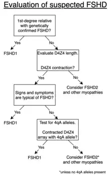 FSHD can be presumptively diagnosed in many cases based on signs, symptoms, and/or non-genetic medical tests, especially if a first-degree relative has genetically confirmed FSHD.[10] Genetic testing can provide definitive diagnosis.[4] In the absence of an established family history of FSHD, diagnosis can be difficult due to the variability in how FSHD manifests.[78]
