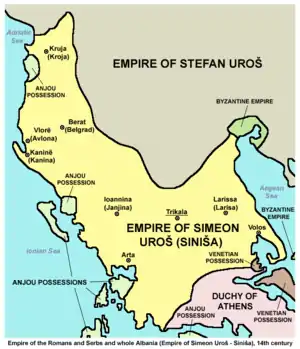 Dušan's half brother Simeon Uroš was expelled from Epirus and sought to obtain Serbia. He marched on Serbia in 1357 after he had himself proclaimed Tsar of the Greeks, Serbs, and Albanians at Kastoria in 1356. The forces of Stephen Uroš met the forces of Simeon near Scutari in Zeta and forced them to back down. Meanwhile, in the Serbian, Bulgarian and Byzantine borderlands of western Thrace, Matthew Kantakouzenos, the son of the Byzantine emperor John VI Kantakouzenos made war on the Serbs in 1356-57 but failed to capture Serres with his five-thousand Turks and was soon defeated in battle by Vojvoda Vojin and held for ransom. The ransom was paid by the Emperor John V Palaiologos and Matthew was allowed to retire to Morea. Now the lands that remained loyal to Uroš were most of Macedonia, including the land between the Struma and Mesta rivers and the Chalcidice peninsula. The lands that remained Serbian could be divided into three main parts: the western territories, including Zeta, the central Serbian lands of Uroš and the southern lands (including the eastern part of Macedonia with Serres its capital).