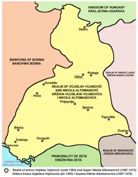 ![]() | Altomanović District (Herzegovina, Raška, North Kosovo and Zlatibor) | Nikola Altomanović | District conquered by neighbouring nobles by 1373. | |