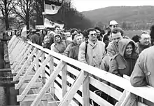 While the eyes of the world were on Berlin, watching the Mauerfall (fall of the Wall), a simultaneous process of Grenzöffnung (border opening) was taking place along the entire length of the inner German border. Existing border crossings were opened immediately, though their limited capacity caused long tailbacks as millions of East Germans crossed over to the West. Within the first four days, 4.3 million East Germans – a quarter of the country's entire population – poured into West Germany.[18] At the Helmstedt crossing point on the Hanover–Berlin autobahn, cars were backed up for 65 km (40 mi); some drivers waited 11 hours to drive across to the West.[19] The border was opened progressively over the course of the next few months. New crossing points were created at many points, reconnecting communities that had been separated for nearly 40 years. At Herrenhof on the Elbe, hundreds of East Germans pushed their way through the border fence to board the first cross-river ferry to run since April 1945.[20] Hundreds of people from the East German town of Katherinenberg surged across the border to see the West German border town of Wanfried, while West Germans poured into East Germany "to see how you live on the other side". East German border guards, overwhelmed by the flood of people, soon gave up checking passports.[21] Special trains were put on to transport people across the border. The BBC correspondent Ben Bradshaw described the jubilant scenes at the railway station of Hof in Bavaria in the early hours of 12 November: