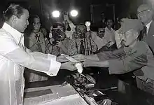 Japanese holdouts persisted on various islands in the Pacific Theatre until at least 1974. Hiroo Onoda offering his military sword on the day of his surrender.
