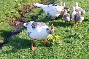 The Faroese goose is a small goose probably brought to the islands during the settlement of Iceland (Landnám) and is probably the oldest form of tame goose in Europe. It can survive without supplementary feed, but most people give it some food during the winter and during egg laying.[3]