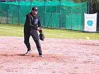 Catching is also a very important part of fast pitch softball. Without a fast-paced catcher, the pitcher will not succeed. The catcher needs to be able to recognize the batters, their hitting style, and the right pitches to call. If there is a bad pitch that hits the ground, the catcher needs to block it so runs do not score, and runners do not advance on the bases. Catchers can also "frame" pitches by pulling the ball towards the center of the plate to convince the umpires to call the pitch a strike. Catchers are protected by a chest guard, helmet, mouth guard, leg protectors, and a specialized mitt.[4] This is due to the proximity of the batters to the catcher. Catchers are responsible for throwing runners out when they try to steal bases, meaning that a catcher must have a strong arm and a quick throw. The catcher is the brains of the team, and carries it as a whole.[5]