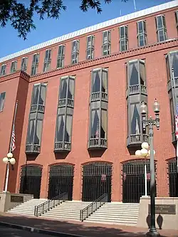 The Federal Circuit was created in 1982 with passage of the Federal Courts Improvement Act, which merged the United States Court of Customs and Patent Appeals and the appellate division of the United States Court of Claims, making the judges of the former courts into circuit judges.[2][3] In addition to the Markey Building, the court also occupies the adjacent Benjamin Ogle Tayloe House, former Cosmos Club building, and the Cutts-Madison House in Washington, D.C., on Lafayette Square. The court sits from time to time in locations other than Washington, and its judges can and do sit by designation on the benches of other courts of appeals and federal district courts. As of 2016, Washington and Lee University School of Law's Millhiser Moot Courtroom had been designated as the continuity of operations site for the court.[4]
