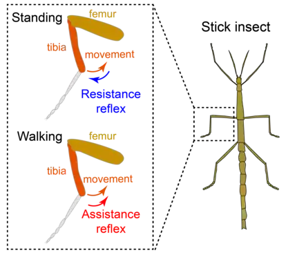 One way in which the femoral chordotonal organ contributes to the control of leg movement is through a resistance reflex, in which a sub-group of femoral chordotonal neurons sense the extension of the tibia and activates the motor neurons that flexes tibia to counteract the movement (Figure 3).[4] During walking, this stabilization reflex is reversed in order to promote the cyclic flexion and extension of the femur-tibia joint necessary for walking (Figure 3).[20][21]