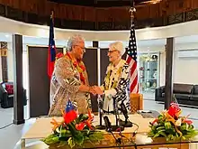 From 24 May to 23 July 2021, her position as prime minister was disputed by Tuilaʻepa Saʻilele Malielegaoi who refused to concede power and locked her out along with her party's MPs from entering the legislative building, despite the ruling of the Supreme Court of Samoa. Her party denounced the move as a "coup".[44][45] In a tent in parliament's gardens, Mata'afa was sworn into office as Samoa's first female prime minister.[46] The Federated States of Micronesia became the first country to recognize her as the legitimate Prime Minister of Samoa.[44] Her government was also later recognised by Palau and the Marshall Islands.[47][48] Tuila'epa accused Mata'afa of treason.[49]