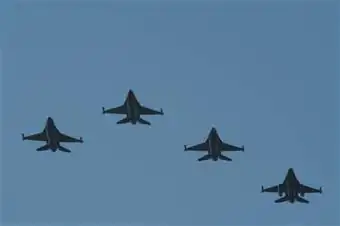 The finger-four formation (also known as the "four finger formation" and the "Fingertip Formation") is a flight formation used by fighter aircraft. It consists of four aircraft, and four of these formations can be combined into a squadron formation.
